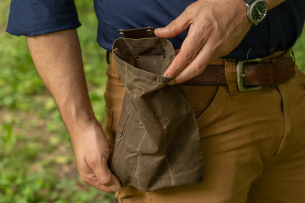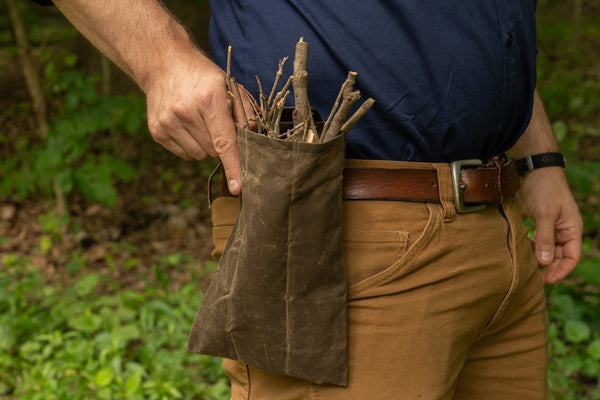 Start foraging in a snap - this waxed canvas foraging bag clips onto your belt or backpack strap and unfolds to carry 60 cubic inches of mushrooms, berries, tinder, and more.